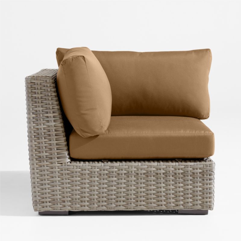 Low-slung and ready to lounge, our Abaco outdoor sectional collection extends an invitation to kick back and relax. Each corner chair is handwoven in grey-brown, weather-resistant resin wicker in a chunky, textural weave. The chair's modern, boldly proportioned frame of lightweight aluminum offers a deep seat. Neatly tailored with bullnose fronts and boxed sides, the off-white seat and back cushions add on a layer of comfort covered in fade-, stain-, water- and mildew-resistant Sunbrella acrylic. The corner with cushions combines with other Abaco sectional components to fashion outdoor seating tailored to your great outdoors.