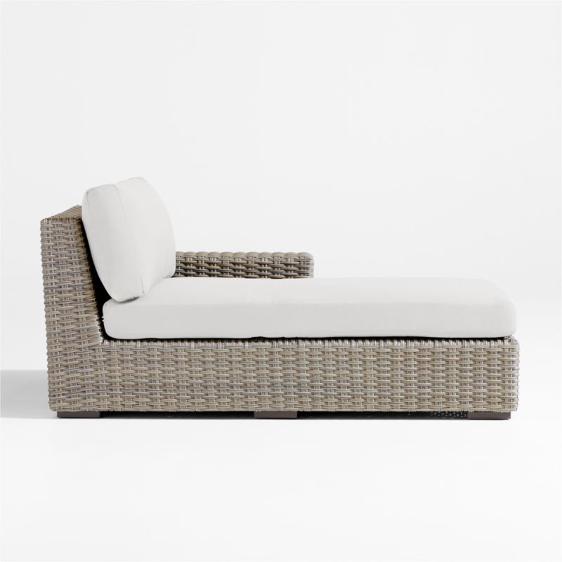 Low-slung and ready to lounge, our Abaco outdoor sectional collection extends an invitation to kick back and relax. Each right-arm chaise is handwoven in grey-brown, weather-resistant resin wicker in a chunky, textural weave. The lounge chaise's modern, boldly proportioned frame of lightweight aluminum offers a deep seat and a wide, boxy arm that's perfect for hosting a cool drink. Neatly tailored with bullnose fronts and boxed sides, the off-white seat and back cushions add on a layer of comfort covered in fade-, stain-, water- and mildew-resistant Sunbrella acrylic. The right-arm chaise with cushions combines with other Abaco sectional components to fashion outdoor seating tailored to your great outdoors.