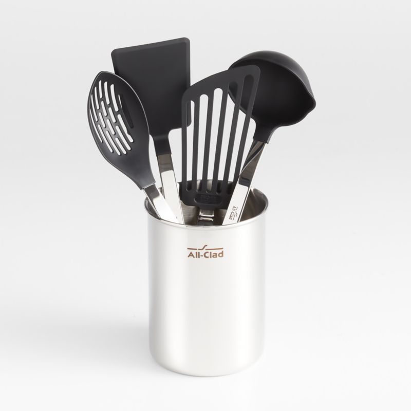 All-Clad extends its commitment to quality cookware to this five-piece set. Each tool in the collection—slotted spoon, solid turner, flexible turner, soup ladle—features BPA-free nylon heads and long-reaching stainless steel handles. Ideal for pots and pans of all sizes, the utensils are safe to use with non-stick coating and are, heat-resistant to 440°F. The set includes a tall, round stainless steel caddy to keep utensils gathered and ready for action.