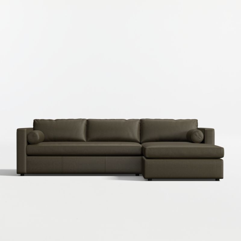 Aris makes modern design soft, cozy and indulgent, upholstered in top-grain leather with rich color and buttery softness. Destined to be everyone's favorite spot to chill, the clean-lined sectional sofa features track arms and a broad deck with deep seat and plush back cushions that invite the gang to get comfortable. A couple of bolster pillows aid in getting the snuggle just right.
