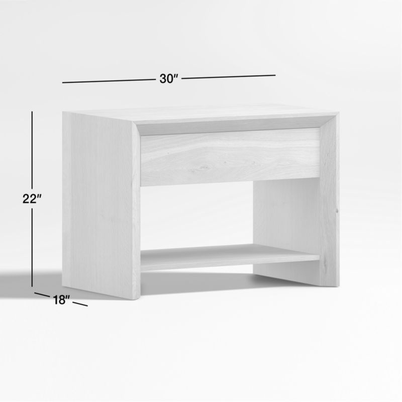 Named after the natural beauty found in the Baja Peninsula, this nightstand celebrates the organic richness of solid white oak. Simple geometry and a natural stain put the focus on the wood's unique grain, knots and markings. Reverse chamfer edges bring dimension to the clean waterfall silhouette, while a single, flat-front drawer and open shelf showcases the wood's lively grain and warm color. Rustic and timeless, the Baja natural oak bedside table is a Crate & Barrel exclusive.