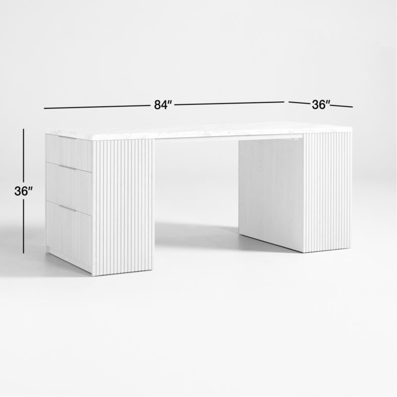 Batten updates the kitchen island with a warm mix of materials and a simplified aesthetic for the modern, contemporary home. Clad in vertical ribbing to bring out the linear design, the almond-finished oak base hosts three deep, storage-ready drawers on both ends. A Volakas marble top complements with unique veining in taupe, blush and grey tones. The streamlined silhouette creates ample leg room to accommodate two counter stools per side (sold separately). A great place to prep and gather, our exclusive kitchen island also makes a great work table, elevated office desk or storage piece in a large, walk-in closet.
