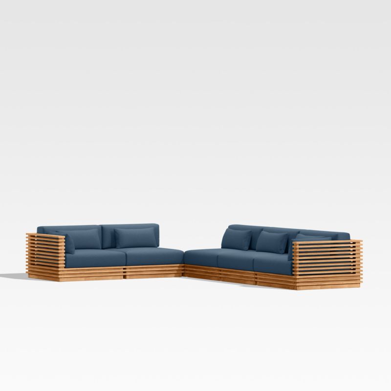 Modern and made for the outdoors, Batten's modular design flexes with your space and entertaining style. Crafted of sustainably sourced, unfinished solid teak, it is built to last a lifetime. The sectional's bold slats, striking linear profile and minimalist silhouette give it a distinctly modern look. A cozy mix of plush seat, back and lumbar cushions plus throw pillows provides unrivaled comfort and can all be upholstered in a weather-resistant fabric of your choice.