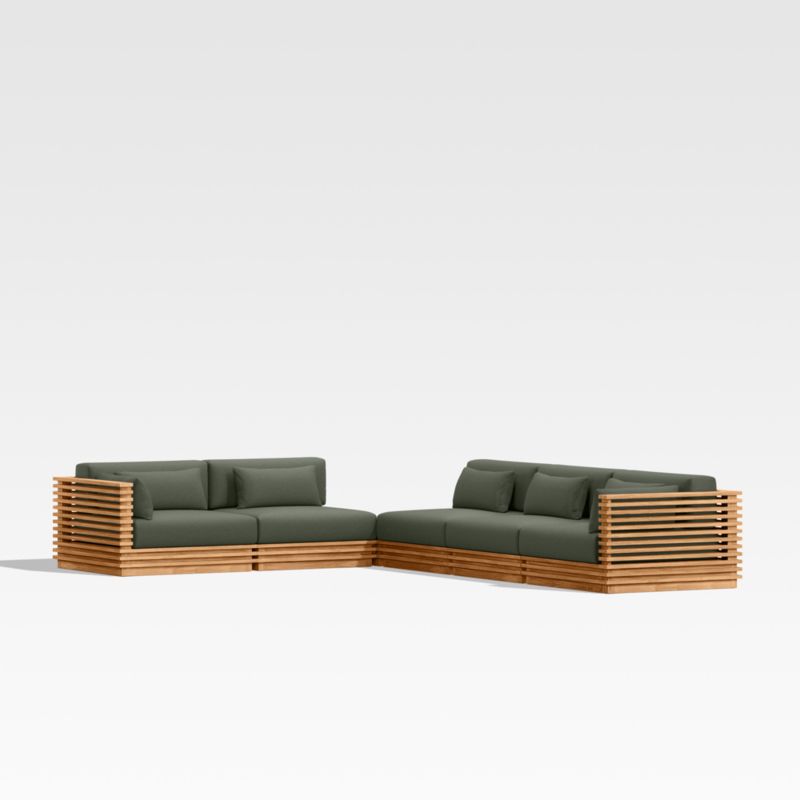 Modern and made for the outdoors, Batten's modular design flexes with your space and entertaining style. Crafted of sustainably sourced, unfinished solid teak, it is built to last a lifetime. The sectional's bold slats, striking linear profile and minimalist silhouette give it a distinctly modern look. A cozy mix of plush seat, back and lumbar cushions plus throw pillows provides unrivaled comfort and can all be upholstered in a weather-resistant fabric of your choice.