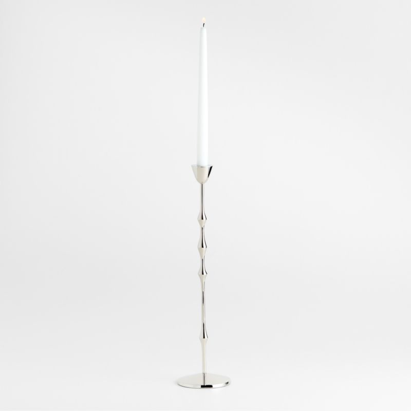 Our take on traditional ornate candlesticks, this taper holder stretches and streamlines the classic silhouette into something sculptural and abstract. Crafted of cast brass with a nickel finish, the candlestick evokes a stream of molten silver. We especially love the way candlelight gleams on the highly polished chrome. Pair the large beaded taper holder with the smaller coordinating candlesticks to set the table with modern glam.