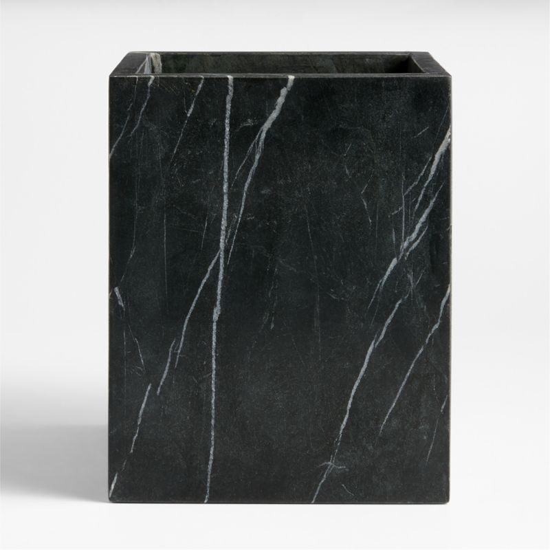 Our Bleecker collection brings the dramatic beauty of black marble to your powder room, guest bath or en suite. Sleek, modern lines keep all the focus on the stone's intriguing grey and white streaks. Cut with crisp corners, this waste basket has a strong presence. Add our other gorgeous-yet-practical Bleecker accessories for a unified bathroom that's ready for hosting. Due to the natural marble, each trash can is fascinatingly unique.