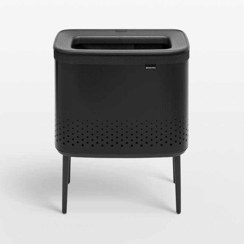 Store laundry in style in this sleek, streamlined hamper. The black-finished steel is perforated in a pleasing pattern that also provides ventilation. Slender legs elevate the bin to a comfortable height, and the low-profile bin fits right against a bathroom, laundry room or bedroom wall. Detailed with indentations that subtly continue the dot motif, the black lid offers a quick-drop opening. A grey cotton laundry bag with a velcro closure fits perfectly in the hamper, holding laundry and toting it conveniently to the washing machine or laundromat.