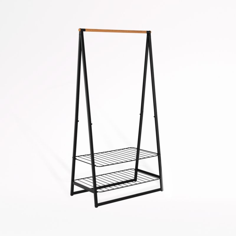 With two adjustable shelves and a sturdy horizontal rod, this rack holds clothes, coats and accessories in style. Black powdercoated steel joins gorgeous natural bamboo for a storage essential with minimalist, Scandi appeal. The bamboo rod holds up to 28 items on hangers, whether ready to wear or air drying, with longer items hanging between the wire shelves. Those shelves adjust for optimal, flexible storage, holding bins, folded clothes, hats and shoes. Attractive enough to display in a modern bedroom, this versatile rack also adds utility to a bathroom, laundry room or mudroom.