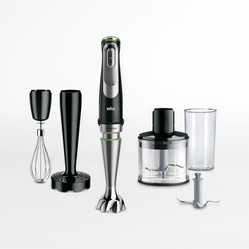 This streamlined blending system combines an immersion blender, hand mixer and food processor in one endlessly handy gadget. The powerful motor powers stainless steel whisk and purée attachments with easy one-hand operation and intuitive speed control—simply press the button harder to increase the speed. Make perfectly smooth soups, smoothies and mayonnaise in the lidded measuring beaker, or blend right in your pot, bowl or pitcher. An extra milling blade makes short work of ingredients, and the flexible shaft moves blades up and down for more thorough blending. The motor body also powers the chopper, creating a handy mini-food processor perfectly suited to chopping onions, herbs, nuts and even ice. Attachments switch out easily and are dishwasher-safe.