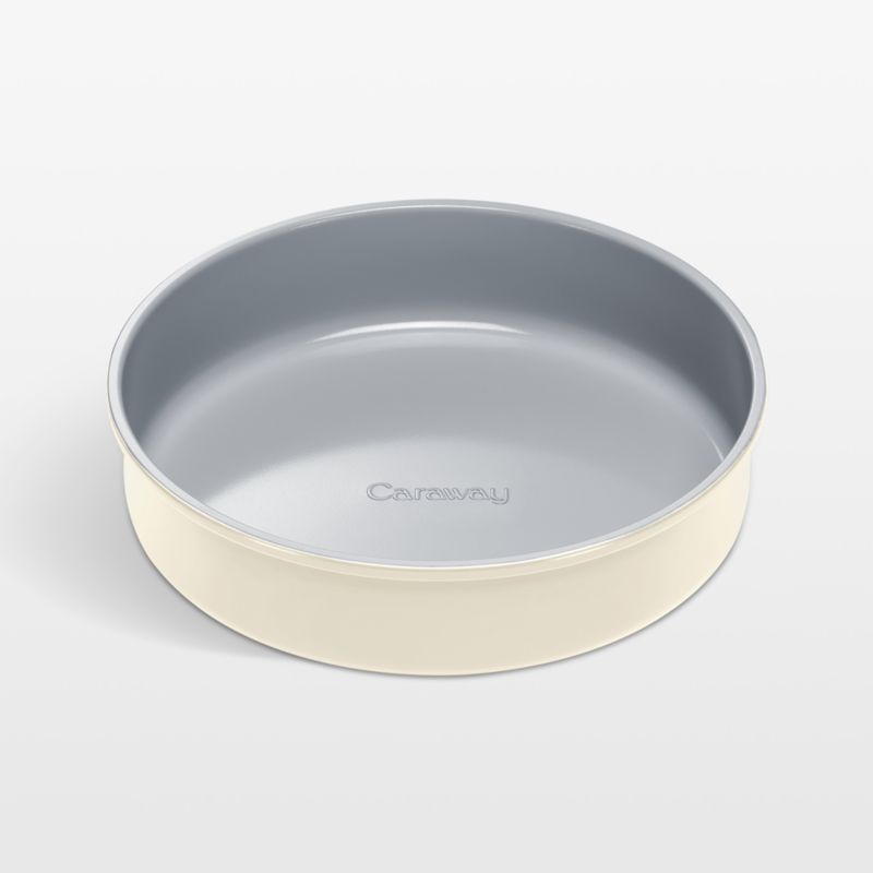 Bake layer cakes, cinnamon rolls and quiches in this essential baking pan. Finished in a naturally non-stick ceramic coating, the aluminized steel pan releases baked goods easily for quick cleanup. The cream-hued exterior gives the round pan a fresh look. Pair with other Caraway Home bakeware to build a modern collection.