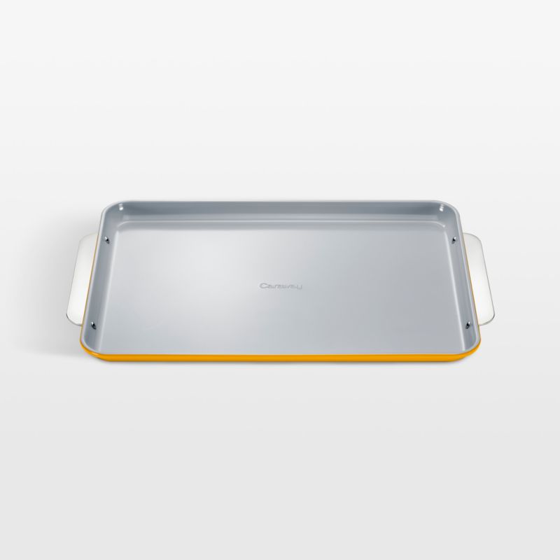 Bake homemade granola, a sheet-pan dinner or a batch of cookies on this essential baking sheet. Finished in a naturally non-stick ceramic coating, the aluminized steel pan releases baked goods easily for quick cleanup. Stainless steel handles offer a sturdy grip, and the yellow-orange exterior inspired by marigolds gives the sheet a fresh look. Pair with other Caraway Home pans to build a modern bakeware collection.