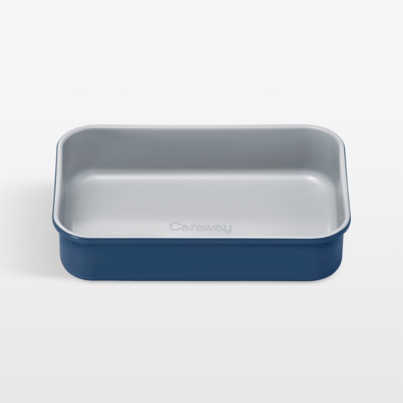 Bake small batches of brownies, cornbread, lasagna and more in this must-have mini baking pan. Finished in a naturally non-stick ceramic coating, the aluminized steel pan releases baked goods easily for quick cleanup. The navy blue exterior gives the rectangular baker a fresh look. Pair with our other Caraway Home mini pans to build a modern bakeware collection perfectly sized for small-space kitchens and compact ovens.