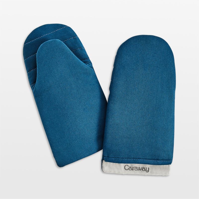 Designed to coordinate with Caraway cookware, this set of two oven mitts protects hands when removing hot pots and pans from the stove or oven. Made of organic cotton in navy blue with grey contrast trim, the quilted mitts are amply padded or a comfortable, heat-resistant grip.