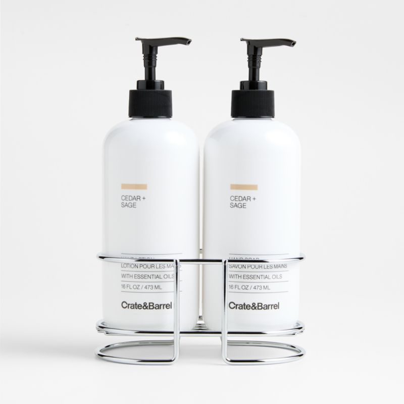 Clean and soothe hands with the earthy, herbal fragrances of cedar and sage. Our gentle liquid hand soap moisturizes with sunflower seed oil and aloe vera as it cleans, while the lotion nourishes skin with mango seed butter and aloe vera. Both are made with plant-based formulas scented with essential oils that entice with the rich aroma of sandalwood and amber sweetened by plum and iris root. Stainless steel curves the two-bottle caddy for a look that's neat and modern.