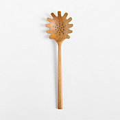 Stir and serve all of your favorite noodles with our signature teak pasta spoon. The clawed head ably handles fettuccine, rice noodles and dumplings, while the constellation of perforations allows liquids to drain away. Showing off its lovely grain, sustainably sourced teak shapes the modern organic tool with a stunning look and a unique handle. The tapered handle shapes a figure eight, adding a sculptural element we love. Combine the pasta spoon with the other exquisitely proportioned utensils in our exclusive Crate & Barrel collection for a well-outfitted workspace that's up to any cooking challenge.
