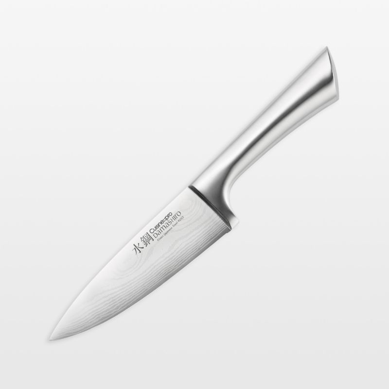 Cuisine::pro's Damashiro knives feature stunning Damascus-style patterned blades suggestive of flowing water and handles inspired by Japanese samurai swords. Made of ice-hardened Japanese steel, the blades are tough, shatter-resistant and honed by traditional methods to a fine, razor-sharp, edge. With its perfectly balanced hollow handle, the chef's knife is ideal for slicing meats as well as chopping, dicing and mincing.