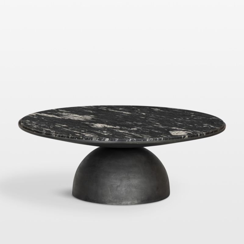 A true work of art, sculptural Dev perfectly balances two sliced spheres to create this gorgeous mixed-material coffee table. Hammered for light-catching texture, the grey-finished aluminum base curves in and out to support an inset tabletop of back marble. We love Dev's visual interplay of rustic metal and dynamically veined marble.