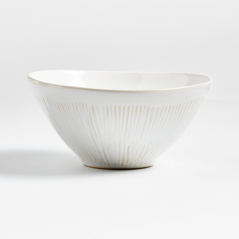 Countless perfectly imperfect lines texture the exterior of this white bowl with the look and feel of artisan ceramics. A filmy white glaze washes over the meal bowl, pooling opaque in the crevices and filming the raised surfaces to show the warm color of the base clay. The oven-safe stoneware dish serves everything from hearty salads to grain or smoothie bowls and cleans up easily in the dishwasher. Part of our Dover white dinnerware and serveware collection, this meal bowl is a Crate & Barrel exclusive.