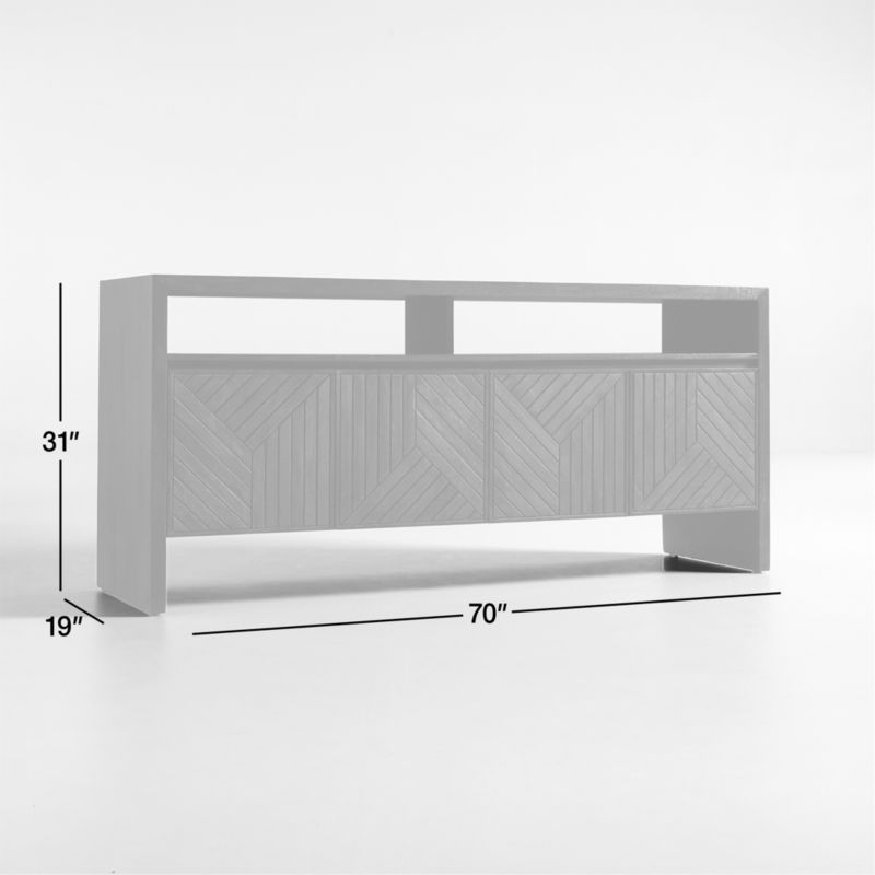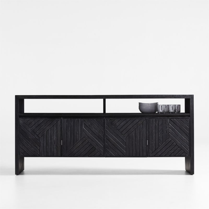 Employing the time-honored technique of parquetry, skilled woodworkers add artisan rusticity to our clean, contemporary Dunewood credenza. Bringing geometric complexity to the sideboard's flat-front doors, each piece of mango wood is carefully cut and inlaid by hand to create a modern mosaic of angled lines. Wirebrushing and an ebonized finish give the buffet a bold and rustic look. Designed by Blake Tovin of Tovin Design, the credenza features an open shelf and two interior shelves.