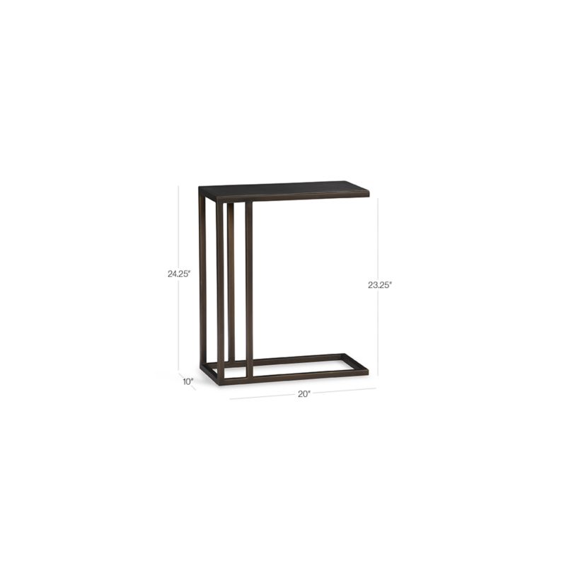 Form and function converge in a clever "C" table that tucks a streamlined surface over sofa, chair or chaise. The bronzed iron, linear open frame pulls up when and where you need it, offering a handy arm side spot for snacks and computing.