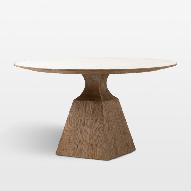 Eila graces dining spaces with an inspired mix of materials and an intriguing silhouette. Made of oak that's wire brushed and given a smoky oak finish, the pedestal base showcases a square, bell-shaped foundation that tapers to hourglass curves. The white marble top showcases its creamy color and unique veining, nestled within an oak base with a dramatically angled chamfer edge.