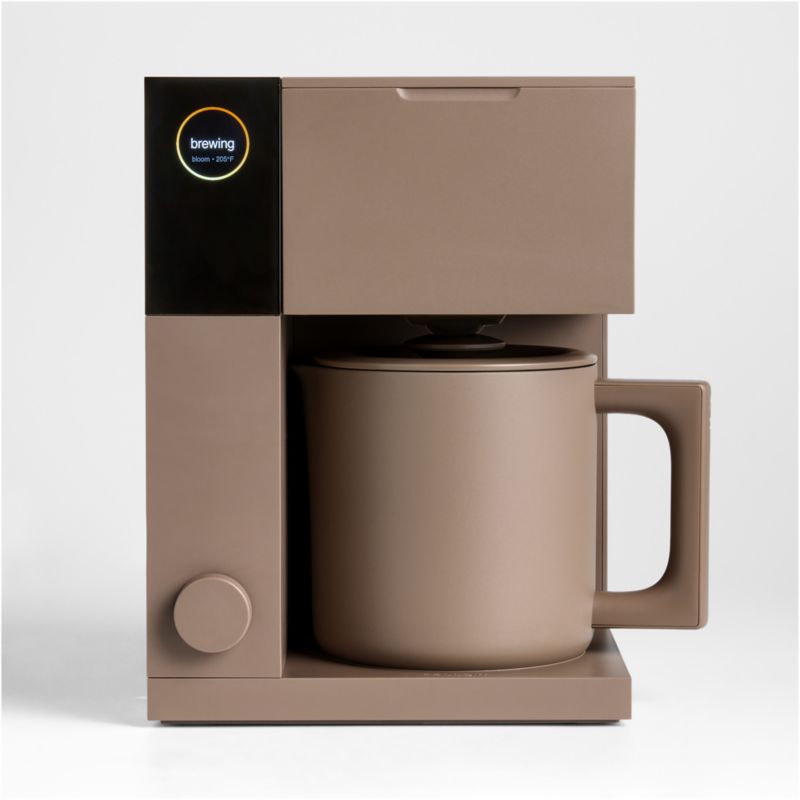 The exacting quality of pour-over coffee with the convenience of drip. This sleek coffee maker from Fellow precisely controls the brewing process to create impeccable coffee automatically. Whether you prefer to make one cup or a whole pot, Aiden dials in the most important variables for brewing quality pour-over coffee—to-the-degree temperature control, precise coffee-to-water ratios and a built-in bloom cycle—and offers the option to dial in your own preferences. Create custom profiles with precise control of eight brewing parameters or choose Instant Brew Mode for delicious coffee at the press of a button. Or use the app to schedule brewing so your coffee is ready precisely when you are. Clean-lined and modern in a warm, creamy hue inspired by malted chocolate, the machine features a matching thermal carafe that keeps coffee warm for hours.
