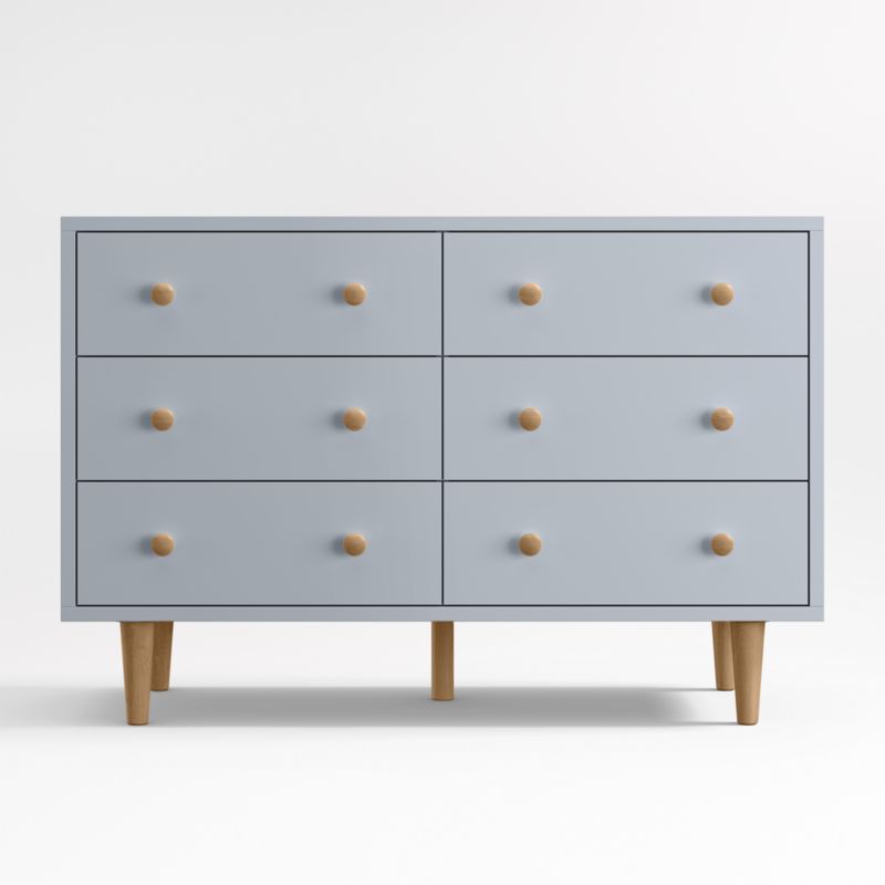 Largely inspired by Scandinavian farmhouse design, our Finn kid's furniture collection blends rustic charm and modern minimalism without skipping a beat. In a cool blue tone that contrasts with natural-finished legs and knobs, the wide dresser creates a calming vibe that's right at home in a nursery or big-kid room alike. Six roomy drawers keep clothes, linens and toys neatly tucked away or bulky items out of sight. Pair with other pieces from our Finn collection for a coordinated look.
