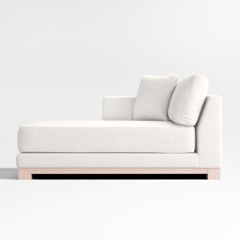 Striking the perfect balance between comfort and modern style, our Gather sectional seating is clean-lined, current and scaled to suit small spaces. Anchored by a natural wood base, the left-arm chaise welcomes you with a boxy, extra-plush seat cushion designed with inner-coil construction for maximum comfort and durability. Trim top-stitching and a knife-edge-tailored throw pillow keep the look neat, not fussy. The Gather left-arm chaise is a Crate & Barrel exclusive.