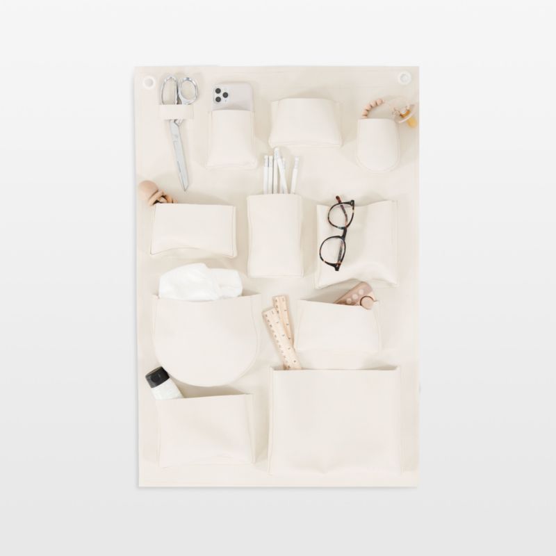 Give kiddos more room to play and create with this space-saving wall organizer you can hang anywhere you're slim on storage. There's a pocket to hold everything, from school supplies and baby essentials to playroom clutter. Crafted of ivory white vegan leather with metal grommets for easy hanging, this modern and stylish cleanup helper adds a touch of warmth to nurseries, bedrooms or shared family spaces.
