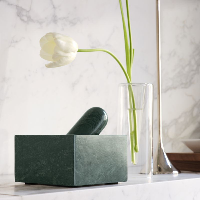 Inspired by the intersection of basic shapes, Daniel Humm designed this functional mortar and pestle as a high-design statement piece. The bold cube base offers a round indentation with ample space for herbs, spices, nuts and more, while the capsule-shaped pestle provides an ergonomic grip. Handcut by skilled craftspeople, the seasoning set harmonizes with the other display-worthy green marble pieces in this exclusive collection that elevate cooking, dining and serving essentials.