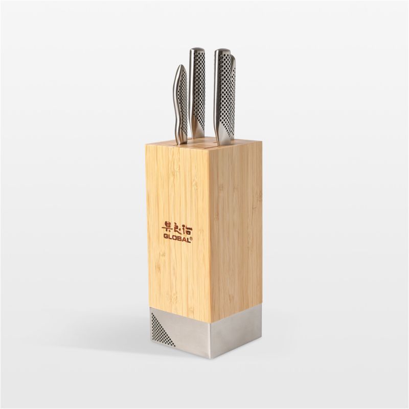 Global's Toshi knife set displays four essentials in a contemporary, space-saving block with eye-catching minimalism. The four knives in the set—3.5-inch paring, 6-inch serrated utility, 8-inch chef's and 8.5-inch bread—feature razor-sharp blades and sand-filled handles with Global's signature dimpled-grip for the ideal weight, balance and slip-resistant comfort. Made of linear bamboo, the upright stand features a stainless steel base that coordinates with the knives' handles.