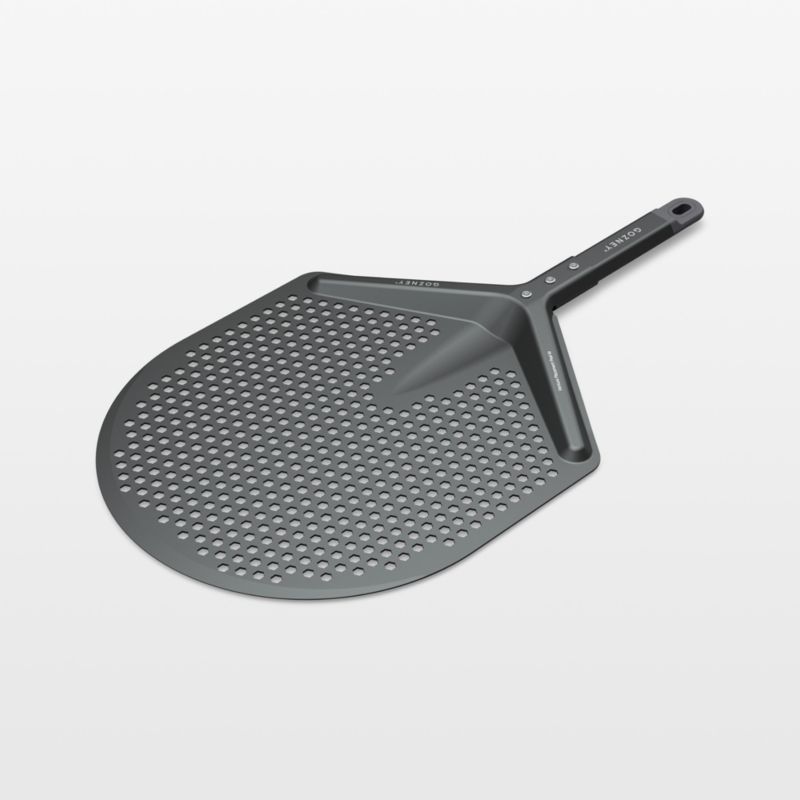 Transfer pizzas into and out of your oven like a pro. Tapered on one end to slide smoothly under pizzas and baking pans, the professional-grade peel is perforated to sift away excess flour and allow steam to escape (key for crispier crusts). Lightweight aluminum makes the tool easy to handle, while the non-stick finish keeps dough and baked goods from sticking. Once your pizza party is complete, the peel cleans up easily in the dishwasher.