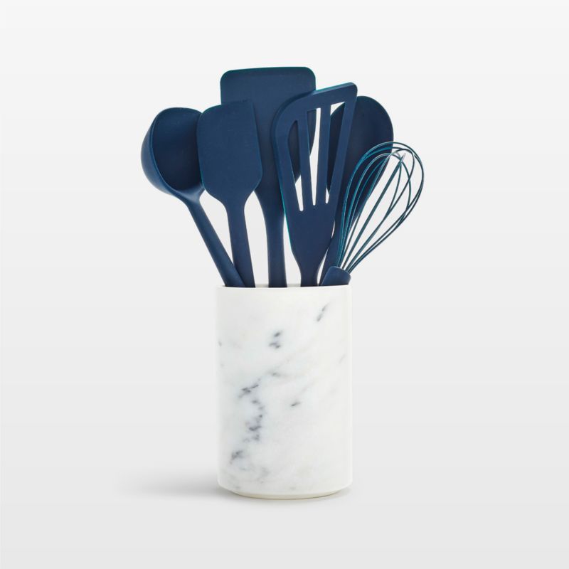 Sleek, seamless and effortlessly chic in classic colors, these six utensils elevate everyday cooking and food prep. The silicone-coated tools are sturdy with metal cores, flexible edges and anti-slip handles for excellent control. Ideal for ceramic non-stick cookware, the utensils gather for counter and stovetop access in a white ceramic crock that resembles marble.