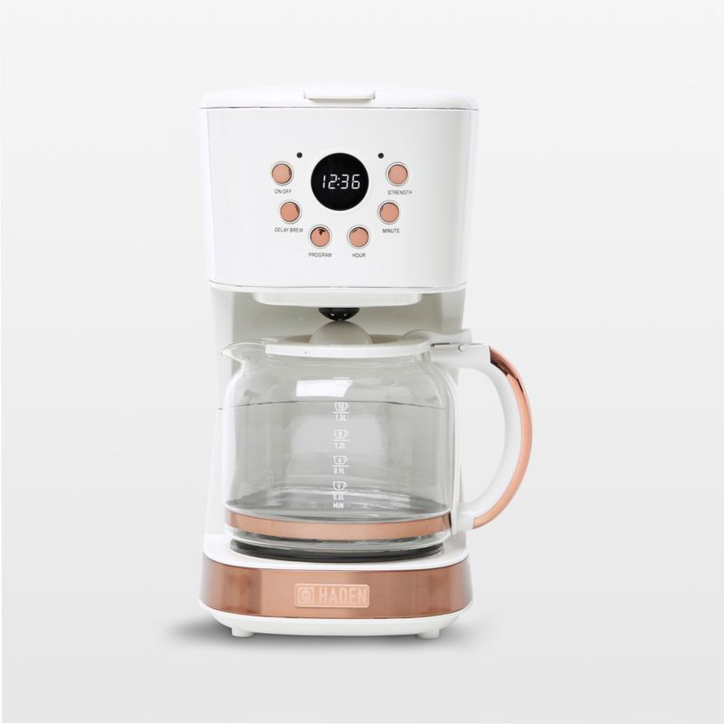 Inspired by traditional British homes, Haden updates the coffee maker in glossy ivory with copper-finished accents for an elevated cozy vibe. The coffee machine brews up to 12 cups, allows you to select your preferred brew strength and offers delay-brew, keep-warm, anti-drip and auto-off functions. Pair the refined coffee maker with matching HADEN appliances for a coordinated kitchen.
