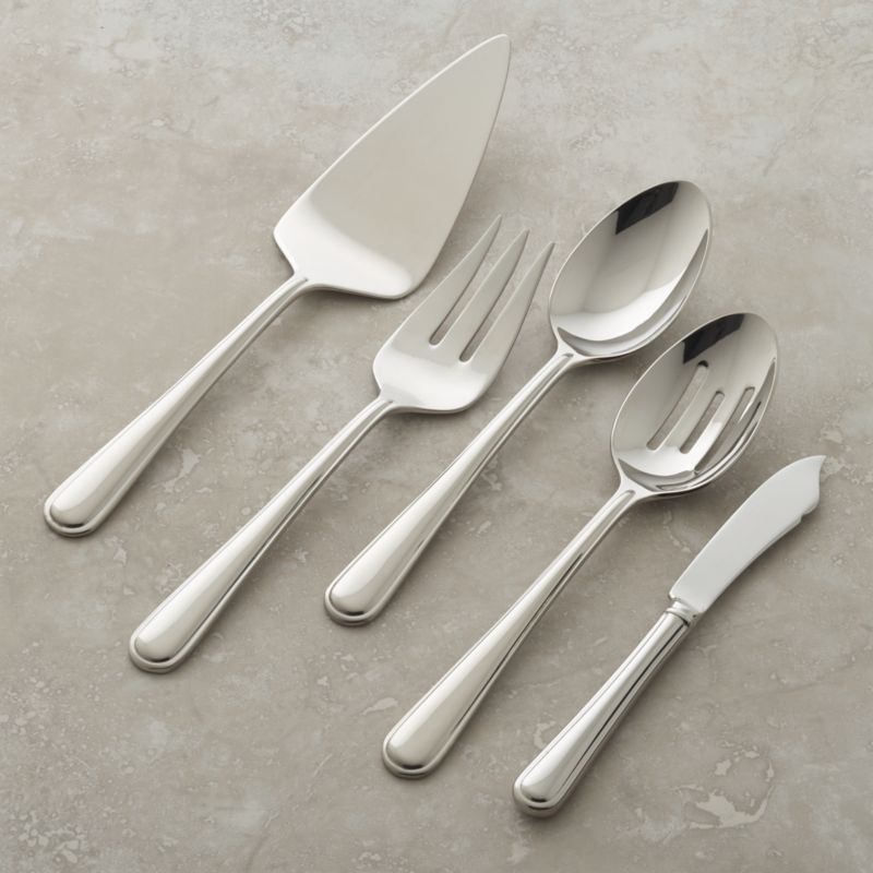 Simply elegant, this heavy-gauge pattern features a bright mirror finish. Rounded handles have raised centers for a dimensional effect. Suitable for both casual and formal dining. Stylish serving pieces complete our Halsted flatware or complement other simple patterns.