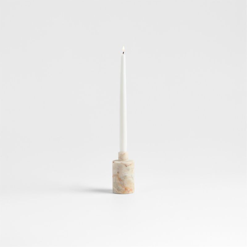 Gorgeously animated with pink highlights on creamy white, red marble shapes our Isola candle holders. The stone's soft hues and organic patterning add organic contrast to the hand-carved taper holder's modern geometric form. Group the tall cylindrical candle holder with its wide and small counterparts in a charming trio or scatter around the room to create a warm atmosphere. Fascinating variations in hue and veining make each one beautifully unique.