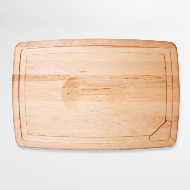 Pure maple shapes a cutting board that offers beauty and utility. Crafted with an indentation in the middle to hold your roasted turkey, beef tenderloin or prime rib, the wooden board is ideal for carving. A juice groove around the edge leads to a pooling well with a spout, allowing you to collect and pour delicious juices to make sauces and gravies. The board reverses to a flat side for chopping and slicing, outfitted with a groove, well and pour spout as well. A must-have for holiday entertaining, this extra-large board makes a useful gift for the consummate host.