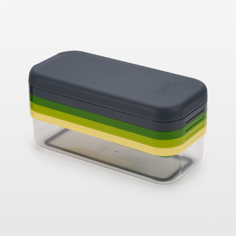 Housed within color-coded holders, this compact prep set features four stainless steel blades that perform a variety of tasks for quick and efficient kitchen prep. To use, select the desired stainless steel blade, secure over the clear plastic bowl and chop, slice, grate or julienne. The blade holders stack on the bowl and get topped with a lid for storage. Ours exclusively, this prep set is indispensable for prepping vegetables, fruit and cheese for all kinds of dishes.