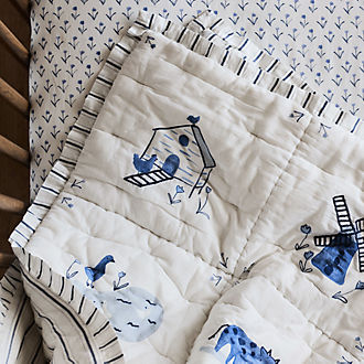 Inspire a sense of imagination and curiosity with baby boy crib bedding from Crate & Kids. Does your family live an adventurous lifestyle? Consider baby boy bedding that enhances the out-of-this-world motif of their nursery. For instance, boy crib bedding that features friendly astronauts and smiling planets are the ideal complement to a solar system nursery mobile and on-theme wall art. Or, if you prefer that baby's room take on a more modern aesthetic, go with crib bedding sets for boys that take advantage of subtle patterns. Think classic pinstripes, small polka dots or simple solid colors. In order to make a more eclectic statement, don't be afraid to mix and match pieces from different crib sets for boys. A solid blue boy crib sheet, for example, helps tie the look of the nursery together when used with an ocean-inspired boy crib skirt and similarly-patterned crib quilt. Are you also looking for nursery decorating ideas for baby girls and gender neutral nurseries? Check out Crate & Barrel's baby girl crib bedding and gender neutral crib bedding.