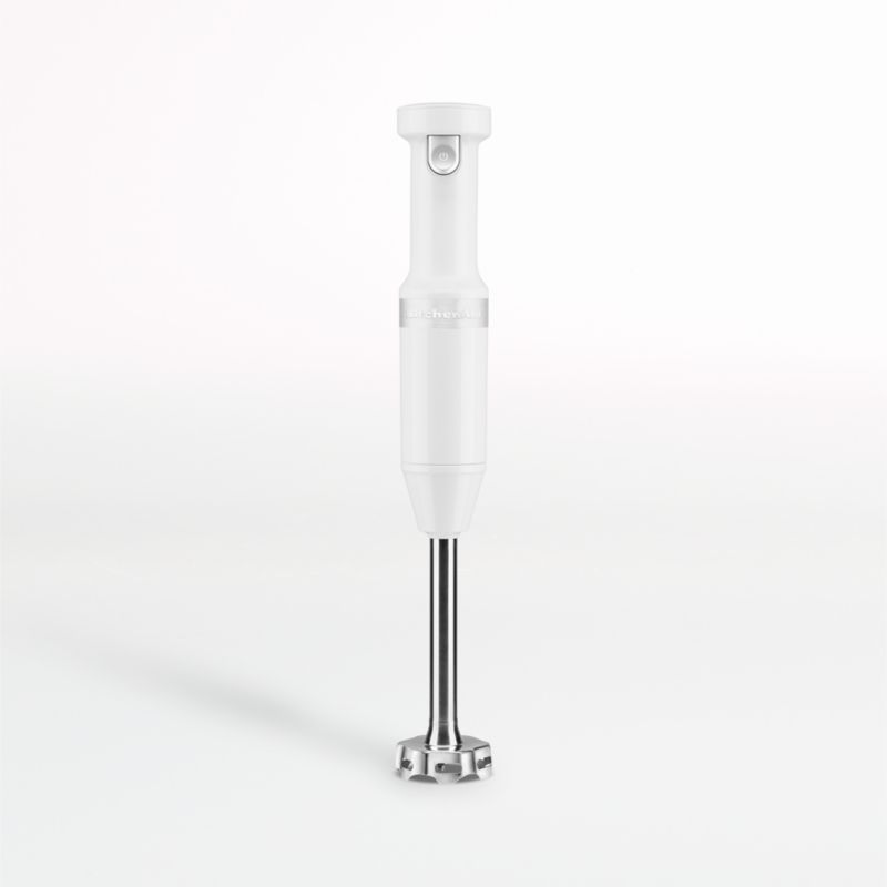 All the power you expect from KitchenAid, without the cord. Great for soups, dips, sauces, pudding and baby food, this cordless hand-held blender in bright white allows you to easily puree and blend anywhere in the kitchen. Designed with a powerful rechargeable lithium ion battery, the immersion blender delivers optimal runtime—blend up to 25 bowls of soup on a full charge (based on 12-ounce/354mL bowls of tomato basil soup made in seven batches)—and performance. The clever pan guard protects cookware from the spinning stainless steel blades, and the blending arm twists off for easy clean up in the dishwasher. The lidded blender jar stores your concoctions in the refrigerator or lets you take them to go.