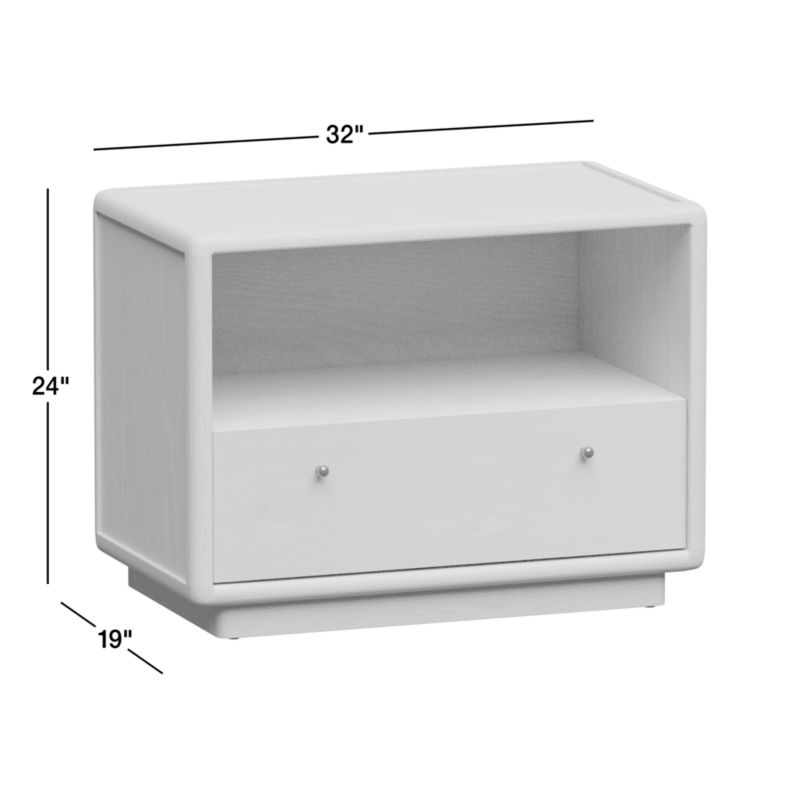 Designed to complement our top-selling bed collection, the Lafayette charging nightstand updates the bed's rounded contours with clean lines and a fresh pearl grey finish. Radiused edges soften the nightstand's square silhouette, while a recessed plinth base lets it float in the bedroom. Made of white oak, the nightstand is given a bleached ash finish to accentuate the wood's cathedral grain. Petite, hand-sculpted pulls with a burnished brass patina add to the nightstand's refined appearance. A single drawer and open shelf provide bedside storage, while integrated power lets you charge devices.