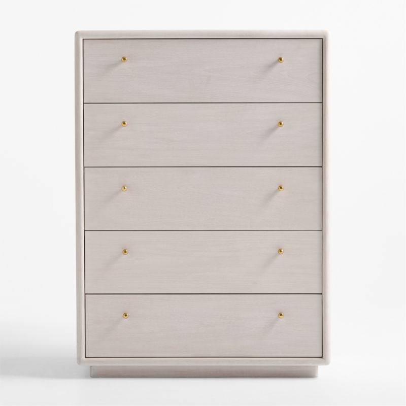 Part of our top-selling bedroom collection, the Lafayette dresser updates the bed's rounded contours with clean lines and a fresh pearl grey finish. Radiused edges soften the dresser's square silhouette, while a recessed plinth base lets it float in the bedroom. Made of white oak, the dresser is given a bleached ash finish to accentuate the wood's cathedral grain. Petite, hand-sculpted pulls with a burnished brass patina dot the tall dresser's five drawers, adding to its refined appearance.