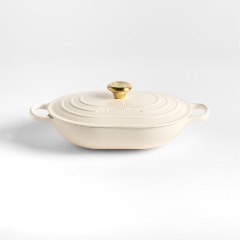 Our exclusive Le Creuset casserole dish showcases a porcelain enamel coating in a creamy hue, a classic color you'll only find at Crate & Barrel. The shallow oval shape accommodates fish, large cuts of meat or vegetables and roasts them to perfection. Topped with a gleaming gold-finished knob, the lid circulates steam to help bake deliciously moist casseroles. Cast iron offers impeccable heat distribution and retention, while the enameled surface minimizes sticking and staining. Designed with sloped sides for effortless serving, the covered casserole goes beautifully from stove to oven to table and cleans up easily in the dishwasher.