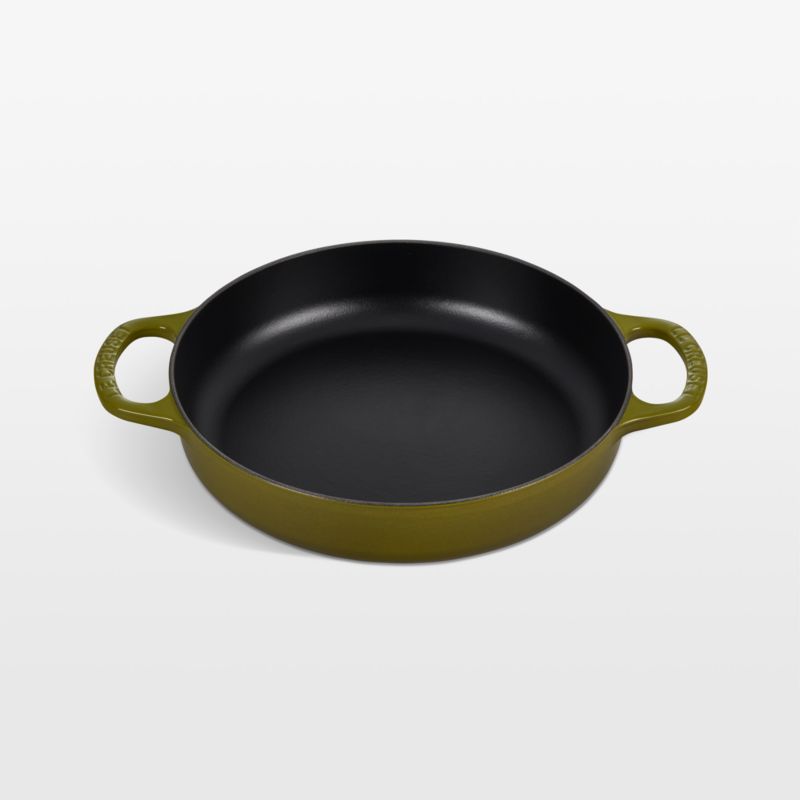Sunbathed green enamel inspired by California's olive groves coats this everyday pan, while the interior boasts a low-maintenance black satin finish that develops a virtually non-stick patina. Along with its wide cooking surface, the pan also offers a generous depth and subtly curved sides that make it easy to stir and flip. Le Creuset's coveted cast iron distributes heat evenly, requires no seasoning and stands up to metal utensils. Ideal for roasting, frying, simmering and more, the warmly hued pan goes effortlessly from stove to oven to table for a sprightly spring presentation.