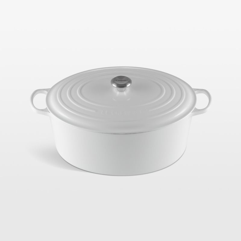 Inspired by oversized cast iron ovens dating back centuries, this goose pot accommodates whole chickens, large roasts, generous loaves of bread or enough chili for a crowd. Deep walls and a secure lid make this pot indispensable for slow-cooking, braising, searing, roasting and baking. The oval oven maintains even and consistent heat and has a smooth interior that promotes caramelization, resists stains and prevents sticking for easy cleanup. Glazed bright white and topped with a gleaming stainless steel knob, the display-worthy goose pot makes a stately centerpiece for family gatherings and holiday feasts.