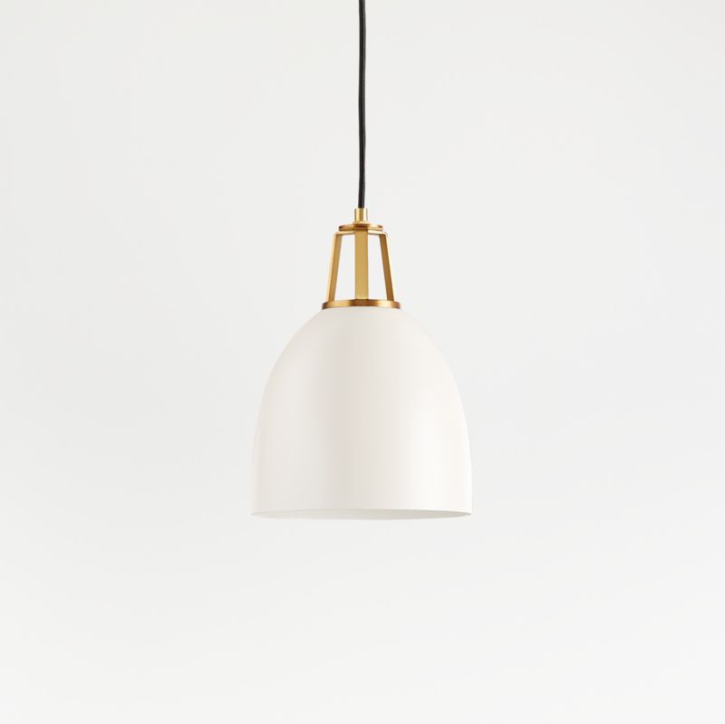 Our Maddox collection mixes and matches finishes and features, creating the perfect combination for your home. Steel shades in a variety of shapes, sizes and modern hues pair matte exteriors and glossy white interiors that reflect light beautifully, accented by decorative socket caps and ceiling plates in a range of finishes. Strikingly simple with bold geometry and brushed brass details, this small dome pendant light in matte and shiny white curves softly. Hang the adjustable-height ceiling light over a kitchen sink, bar cart or bedside table for a clean, graphic look and useful illumination. Blake Tovin designed our exclusive Maddox collection to be as flexible and functional as the modern home.
