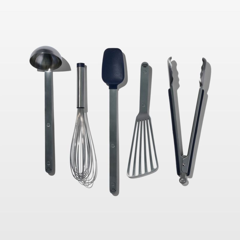 These professional-quality, restaurant-tested utensils make cooking easier. Made of durable stainless steel with blue accented handles, the set includes five essential kitchen tools. The ladle features a deep basin and long handle to serve and pour liquids, and the slotted fish turner has a long, flexible head that slides easily under foods. A perfectly balanced whisk ably blends, whips and stirs, while the scalloped-edge tongs are ideal for grabbing, turning and plating. Perfect for using with metal and non-stick cookware, the spoonula has a blue silicone head that makes mixing, spreading and scraping easy.