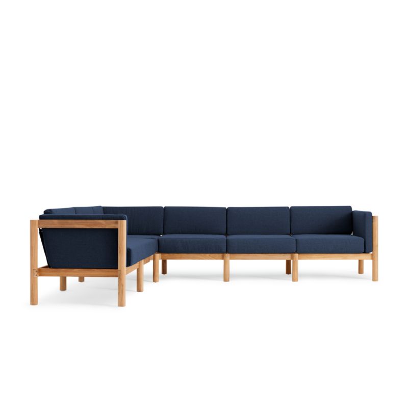 Space-saving yet deep-seated, this sectional sofa invites family and friends to kick back and enjoy the great outdoors. Boxy seat and back cushions upholstered in navy blue are curl-up comfy, while slim side bolsters add a soft layer for draping arms. Natural teak shapes the chunky, rounded frames complemented by hand-stretched polyester rope backs that angle slightly for a comfortable recline. Offering living-room looks with surprising durability, the L-shaped outdoor sectional withstands the elements in weather-resistant teak and fast-drying foam cushions.