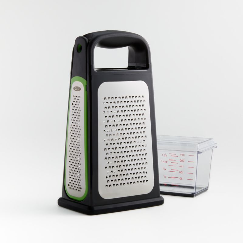 Grate, slice and zest with this easy-to-use gadget. The four-sided box grater includes a soft-grip handle, non-slip base and a stainless steel slicer, medium grater, coarse grater and removable zester. The zester pops out for easy use and cleanup when you just need citrus, cheese or chocolate zest. For neat grating and measuring, place the box grater over the clear plastic container, then snap on the lid to store your ingredients until you need them.
