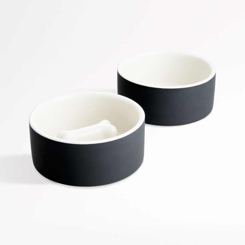 Designed for a clean, contemporary look, these medium matte black-and-white bowls contribute toward your dog's well-being. The water bowl keeps your dog's water cool and fresh for hours after a quick soak. The raised bone design on the interior of the food bowl forces the pet to eat around the shape, slowing down eating and preventing over-eating and indigestion.